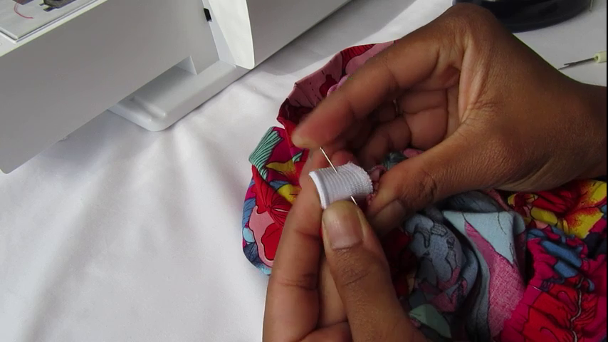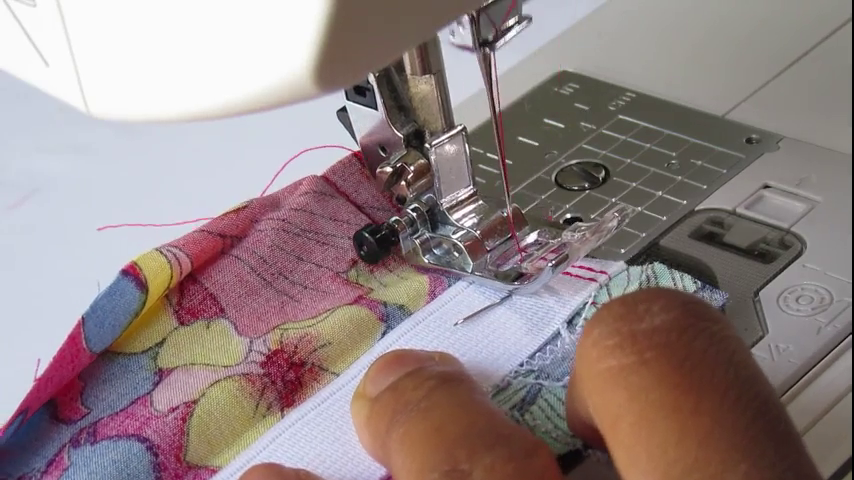 Piquez ensuite en n’hésitant pas à faire plusieurs aller-retours pour que l’élastique soit maintenu solidement. Attention : je vous conseille de lire le Nota suivant avant de piquer.