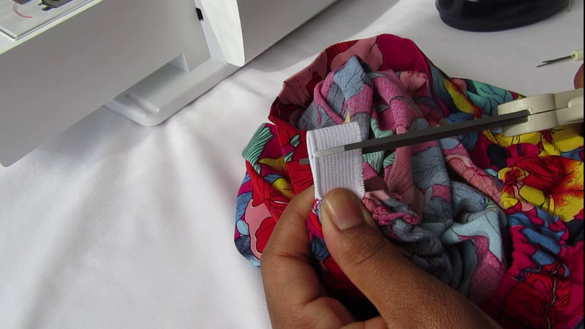 Essayez la ceinture quand l’élastique est cousu. Et si la tension de l’élastique ne vous correspond pas, coupez l’excédent d’élastique déjà cousu, maintenez les 2 bords coupés avec une épingle et cousez un point zigzag le plus serré possible de 2 mm de large à 5 mm du bord. Puis coupez l’excédent entre la couture zigzag et les bords :