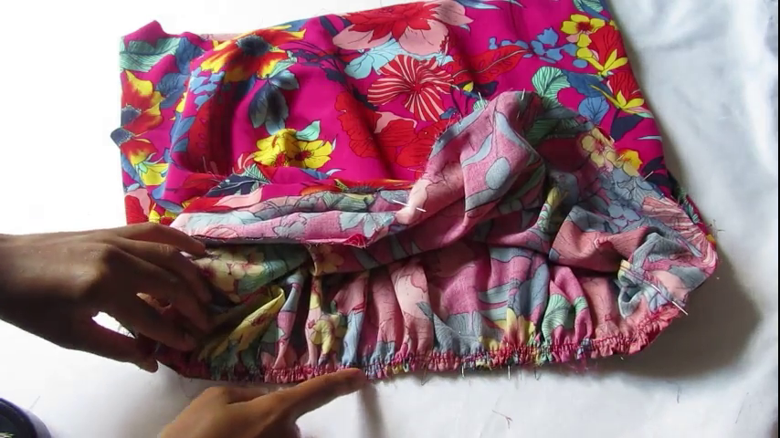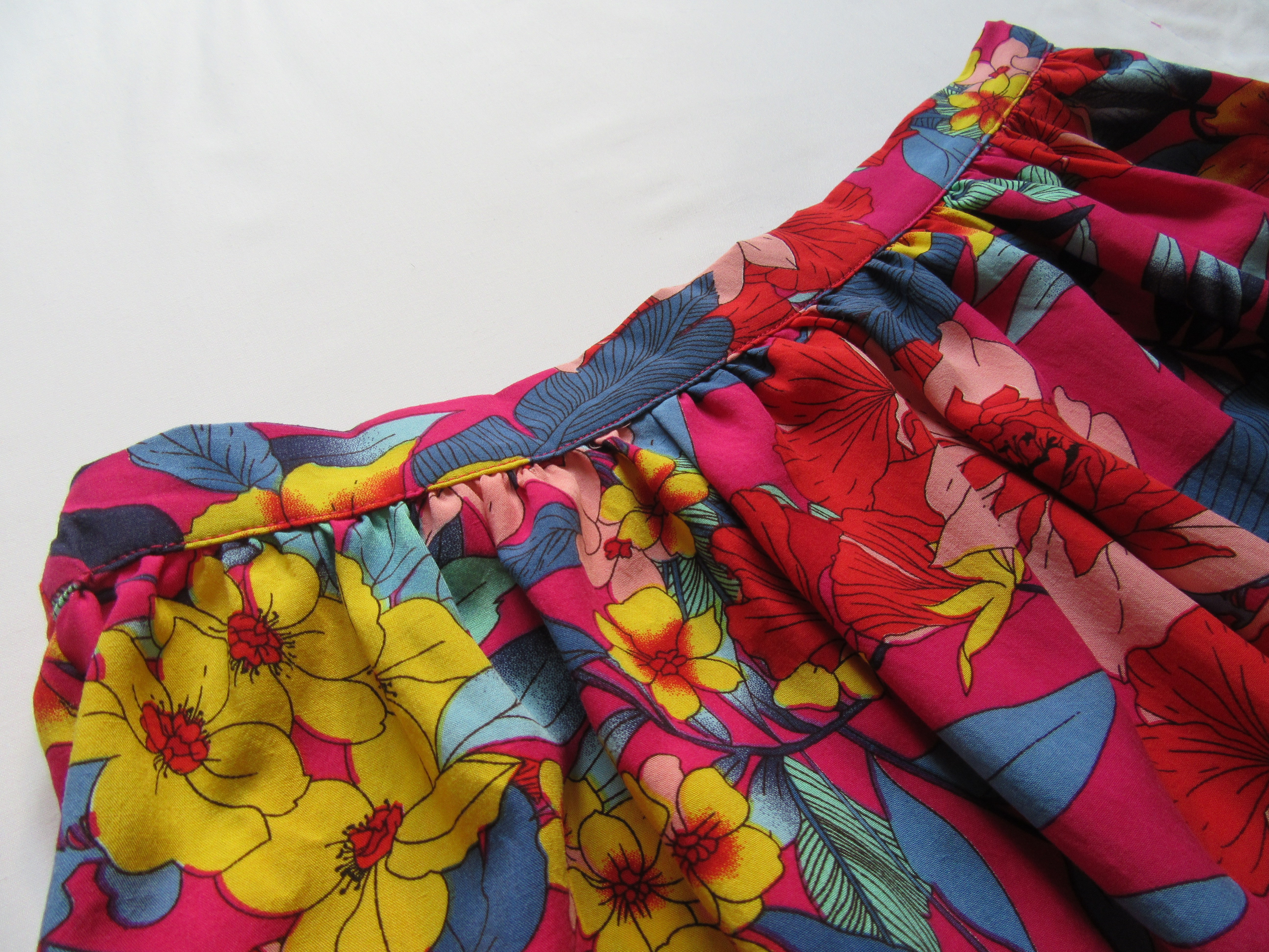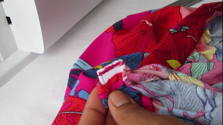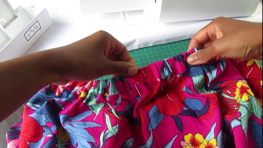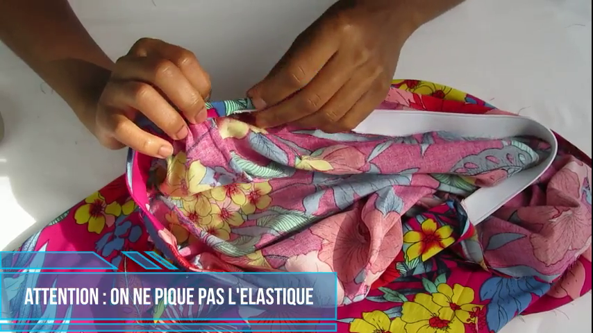 Vous verrez ensuite qu’à un moment, l’élastique devient trop court pour rabattre le tissu par-dessus. Tirez alors sur l’élastique et faîtes froncer la partie de tissu déjà épinglée (c’est pour cela qu’il ne faut pas piquer l’élastique car sinon vous ne pourrez pas tirer dessus pour faire froncer le tissu). Continuez alors à épingler la ceinture à la jupe et répétez l’opération de fronce si nécessaire.