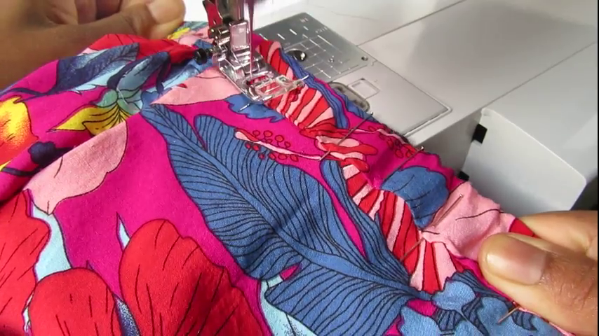 - pour la ceinture dos, il faudra tirer à la fois devant et derrière le tissu pour ne pas déformer l’aiguille (cf. vidéo). C’est pour cela qu’il est nécessaire de répartir de façon équitable les fronces de la ceinture dos avant de piquer. Attention à ne pas piquer l’élastique ; il faut piquer entre l’élastique (qu’on sent du doigt quand on touche la ceinture dos) et la précédente couture.