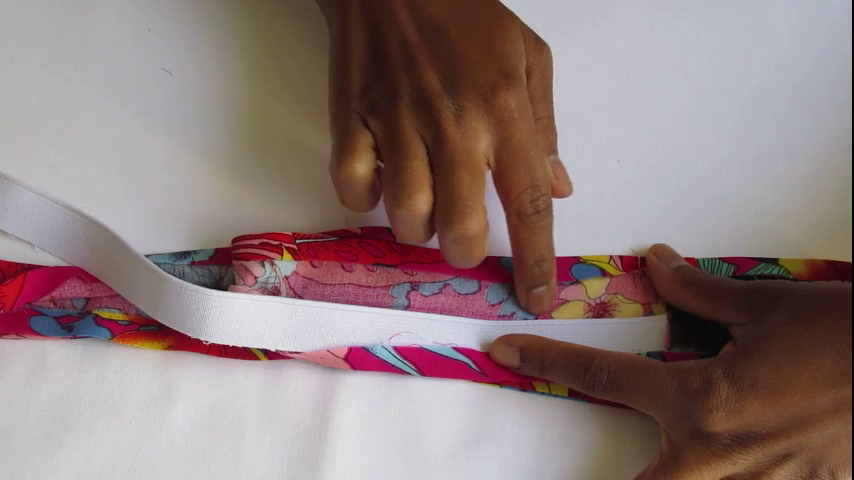 Positionnez l’élastique au niveau de l’une des jointures (marges de couture) de la ceinture au vous rapprochant le plus possible du pli central (dernier pli fait à l’étape précédente). Puis fixez-le à l’aide d’une ou deux épingles.